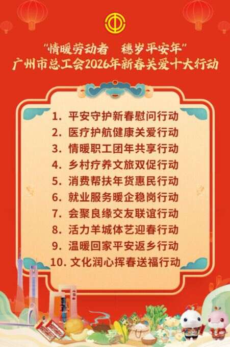 据介绍,广州工会开展平安守护新春慰问行动,为2万名重点职工定制“三重复合礼包”,包含米油腊味等基础年货、广式糕点非遗手信及帮扶产品特产;开展温暖回家平安返乡行动,为2400名来穗务工人员补贴返乡车票,通过“驻地慰问、送站返乡、接站关怀、小年团圆”四大场景,打造“大湾区建设者团圆第一程”服务标杆;开展文化润心挥春送福行动,开放职工书屋、工人文化宫等工会服务职工阵地,举办醒狮、广绣、榄雕等“广府非遗体验周”,组织书法家进企业写春联送福字,让优秀传统文化浸润职工生活;开展医疗护航健康关爱行动,为超1万名新业态领域工会会员赠送覆盖42类重疾的互助保障(最高6.5万元关爱金),提供2000个“暖新体检专场”名额,结合“送检上门+定点预约”服务,并配套心理团辅、心灵剧场等心理健康活动;开展情暖职工团年共享行动,邀请3000名先进职工和新就业形态劳动者等代表共赴新春团年饭,各区工会驿站同步开展共享团年饭活动;开展乡村疗养文旅双促行动,组织200名新业态劳动者赴从化、增城、花都等地开展“乡村疗休养”,联动广州15家省级职工疗休养基地推出农耕体验、非遗研学活动,激活乡村文旅消费;开展消费帮扶年货惠民行动,举办“十城联动促共富 千品惠购暖新春”活动,展销对口帮扶地区及本地特色产品,发放工会会员满减券、购物福袋,支持直播带货,线下商圈、园区同步展销,激活春节消费市场;开展活力羊城体艺迎春行动,举办第36届“羊城春节体育花会”;开展就业服务暖企稳岗行动;开展会聚良缘交友联谊行动。