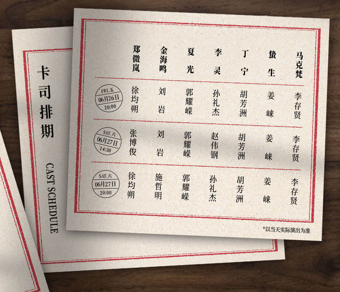 深圳站演出汇聚当前中文音乐剧舞台上一批实力与人气兼具的演员:徐均朔、张博俊将分饰敏感内向的青年编辑郑微岚;刘岩、施哲明共同诠释温柔深沉的作家金海鸣;郭耀嵘再度出演亦真亦幻的神秘女子夏光;孙礼杰、赵伟钢饰演七人会核心李灵;胡芳洲、姜崃、李存贤分别饰演丁宁、蛰生与马克梵。