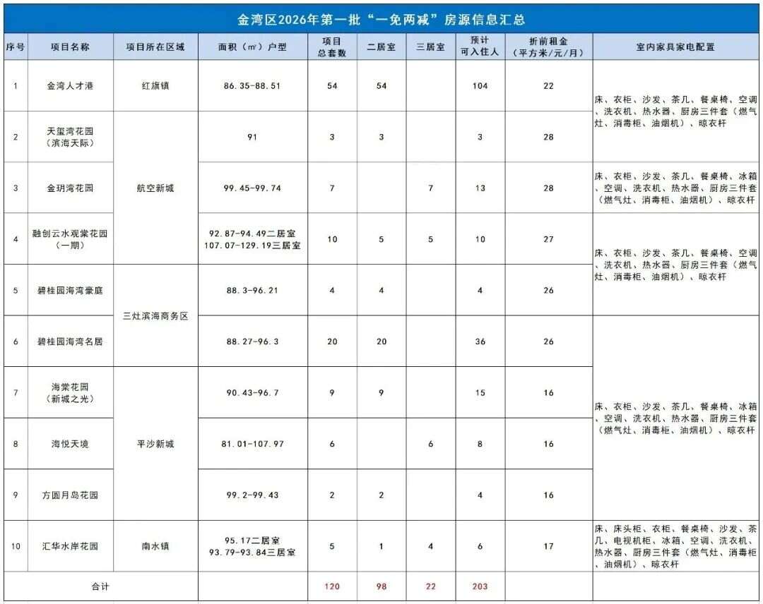 120套房源,精装住房、可拎包入住,第一年免费住!珠海金湾区、经开区2026年第一批“一免两减”人才住房将于3月30日起开放申请!