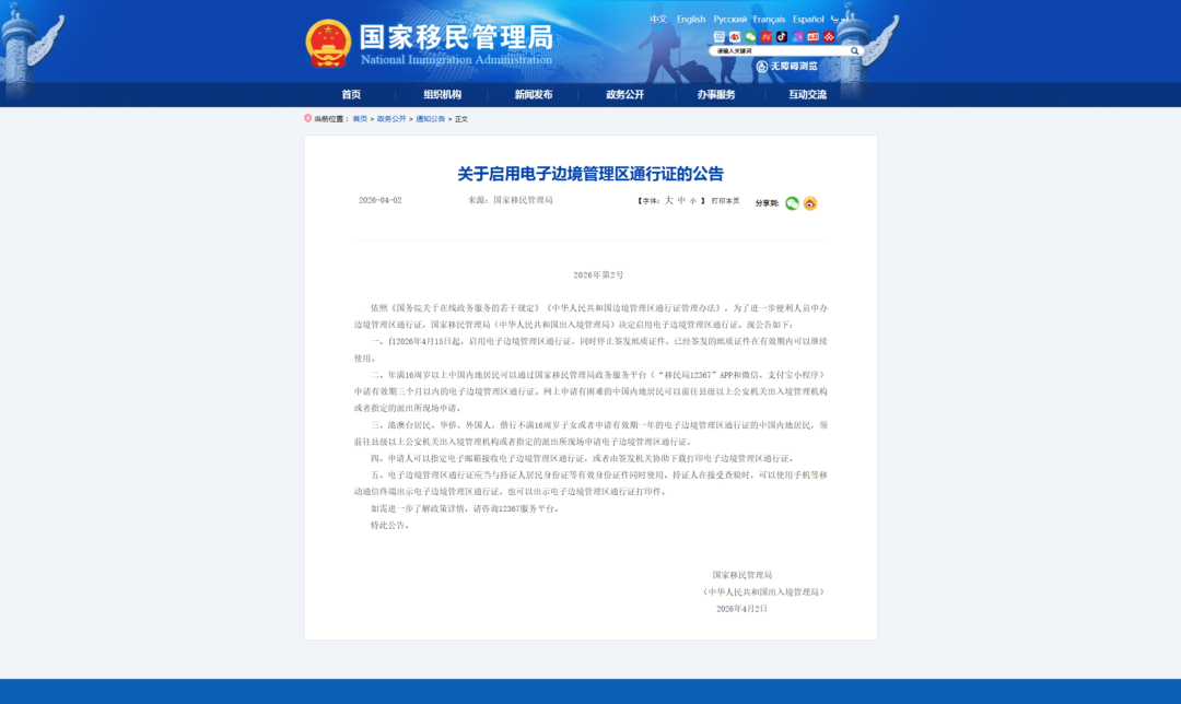 一、自2026年4月15日起,启用电子边境管理区通行证,同时停止签发纸质证件,已经签发的纸质证件在有效期内可以继续使用。