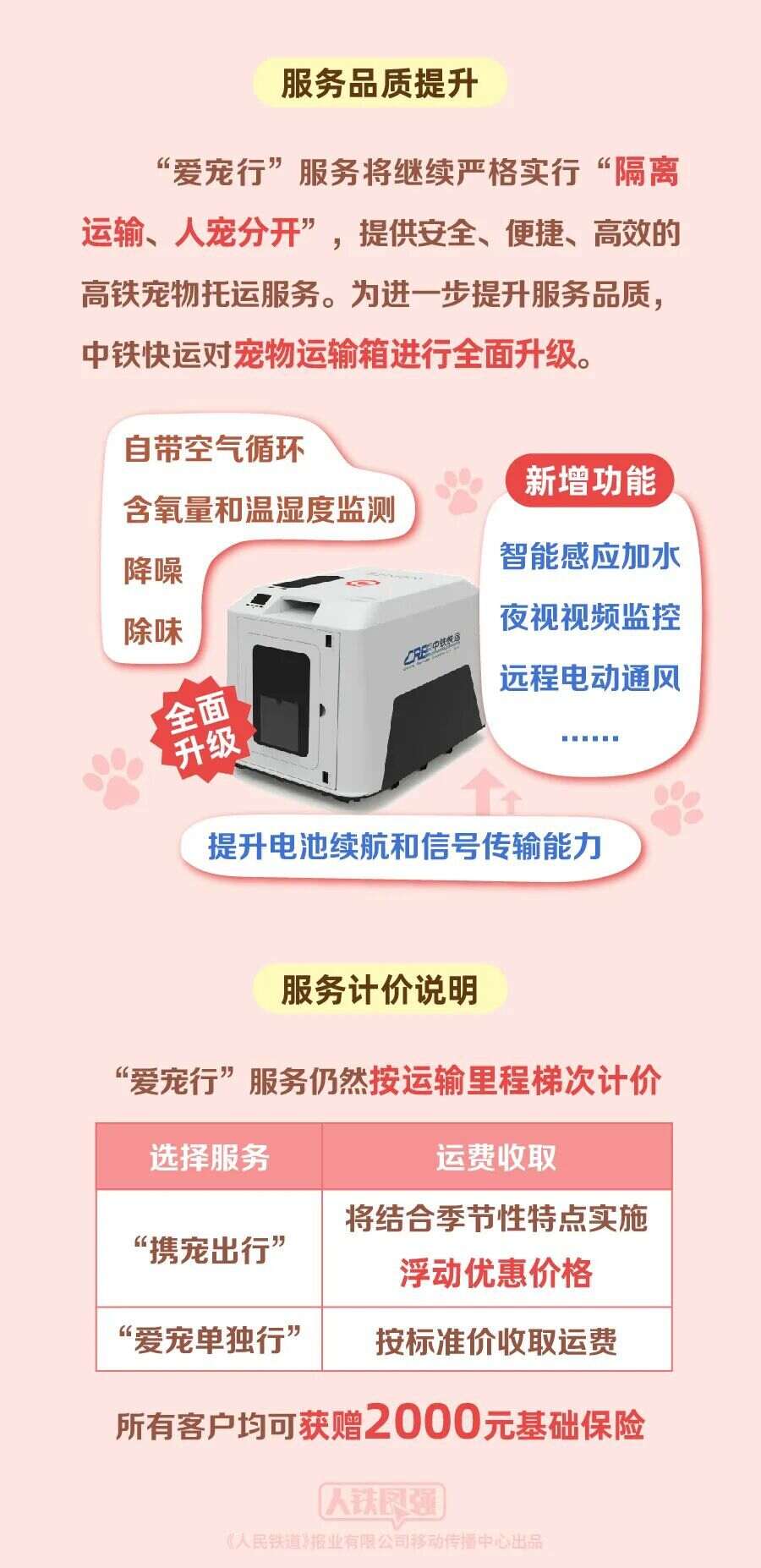 “爱宠行”服务将继续严格实行“隔离运输、人宠分开”,提供安全、便捷、高效的高铁宠物托运服务。为进一步提升服务品质,中铁快运对宠物运输箱进行全面升级,在自带空气循环、含氧量和温湿度监测、降噪、除味功能的基础上,新增智能感应加水、夜视视频监控、远程电动通风等功能,提升电池续航和信号传输能力。