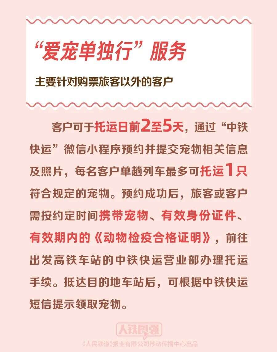 “爱宠单独行”主要针对购票旅客以外的客户,客户可于托运日前2至5天,通过“中铁快运”微信小程序预约并提交宠物相关信息及照片,每名客户单趟列车最多可托运1只符合规定的宠物。预约成功后,旅客或客户需按约定时间携带宠物、有效身份证件、有效期内的《动物检疫合格证明》,前往出发高铁站的中铁快运营业部办理托运手续。抵达目的地车站后,可根据中铁快运短信提示领取宠物。