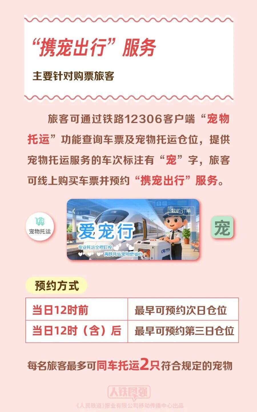 其中,“携宠出行”服务主要针对购票旅客,旅客可通过铁路12306客户端“宠物托运”功能查询车票及宠物托运仓位,提供宠物托运服务的车次标注有“宠”字,旅客可线上购买车票并预约同车宠物托运服务,每日12时前最早可预约次日仓位,12时(含)后最早可预约第三日仓位,每名旅客最多可同车托运2只符合规定的宠物。