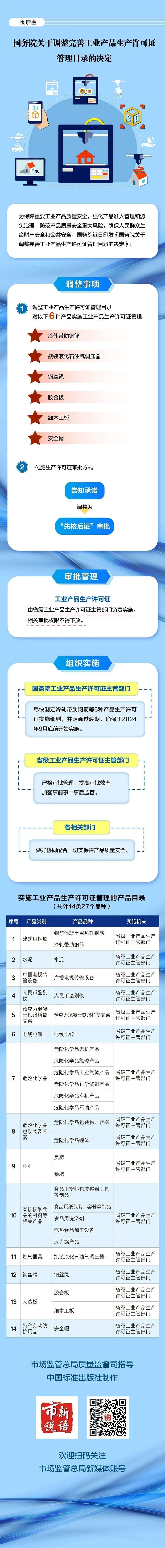 为保障重要工业产品质量安全,强化产品准入管理和源头治理,防范产品质量安全重大风险,确保人民群众生命财产安全和公共安全,国务院近日印发《国务院关于调整完善工业产品生产许可证管理目录的决定》,具体内容如下:
