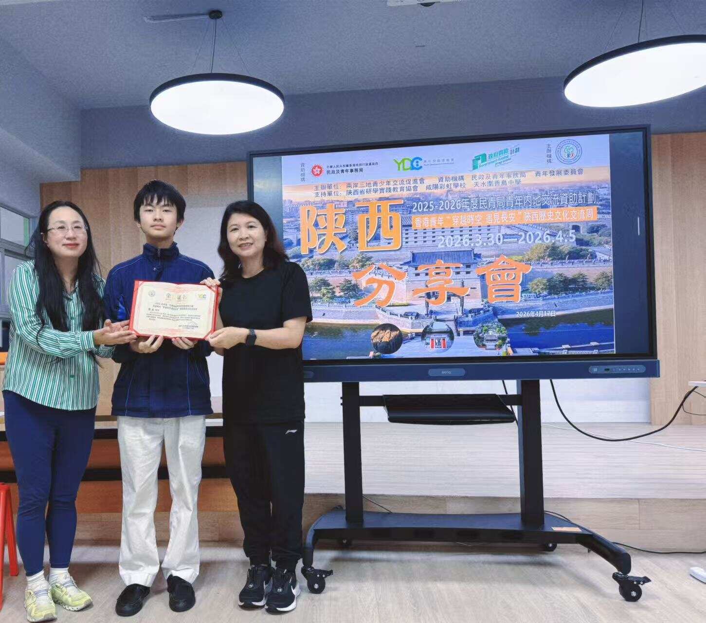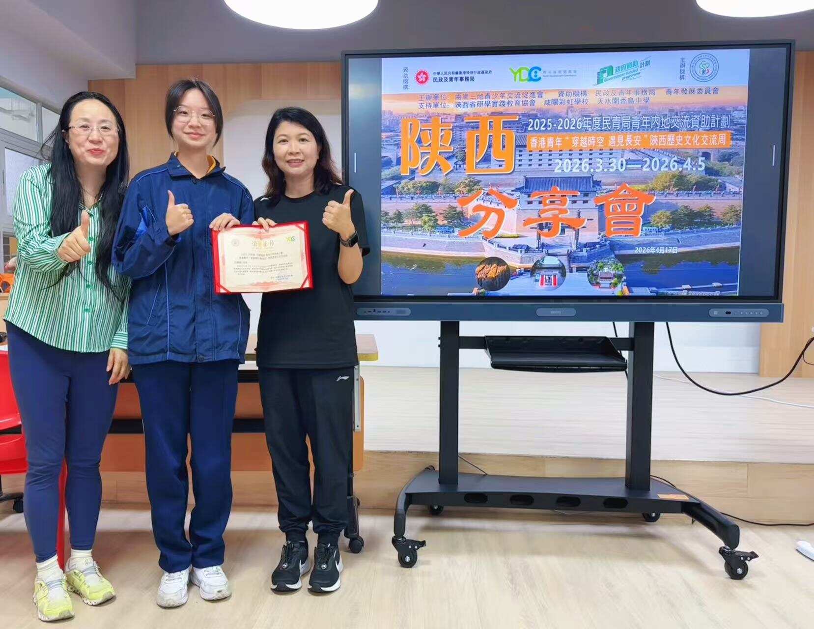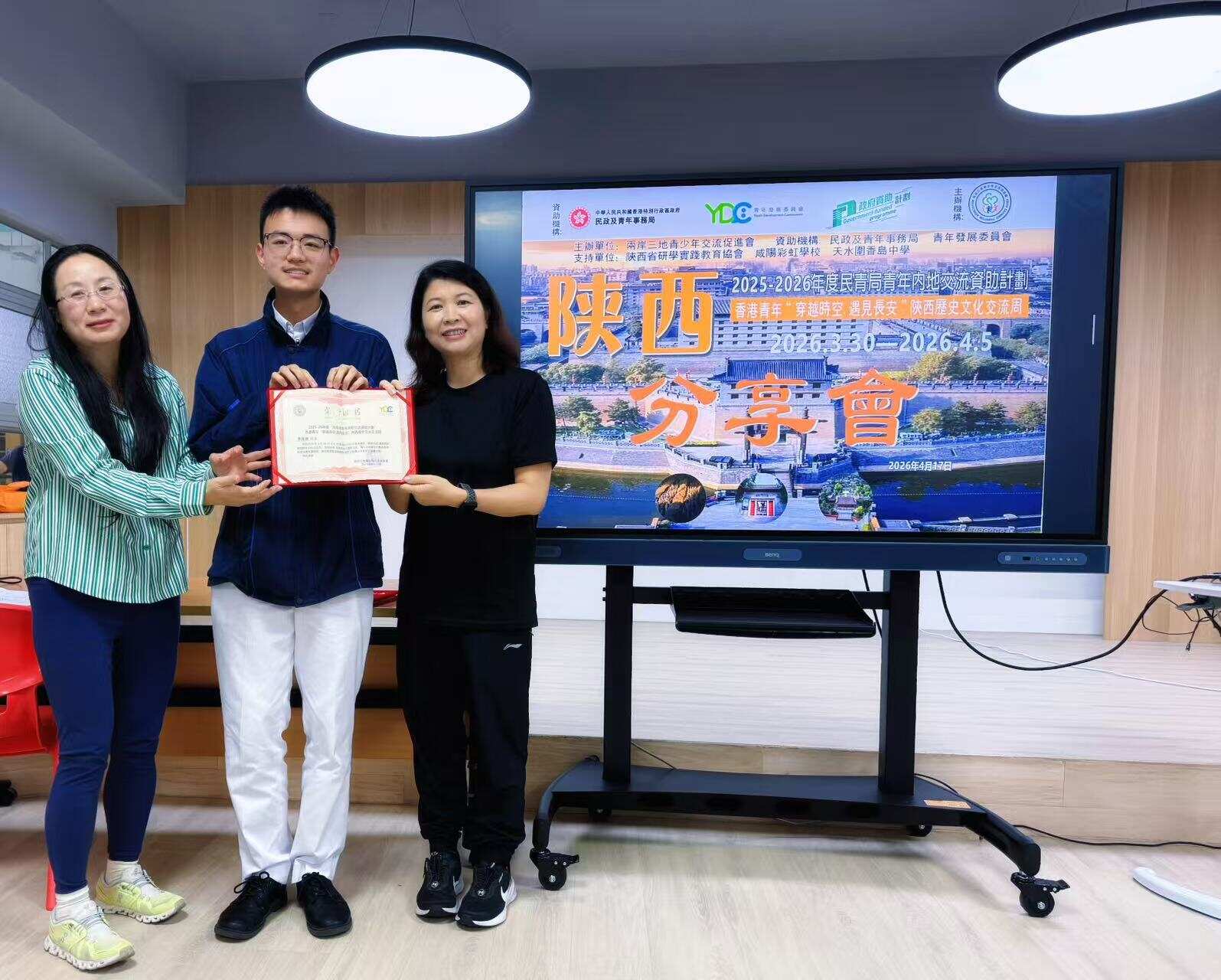 4月17日,香港青年“穿越时空 遇见长安”陕西历史文化交流团分享会及图片展览在天水围香岛中学顺利举办。香岛中学校长陈锦媂、校长助理王文斌,两岸三地青少年交流促进会常务副会长兼交流团团长王荣平、副团长李卓立及刘凯怡师生代表共20余人出席活动。