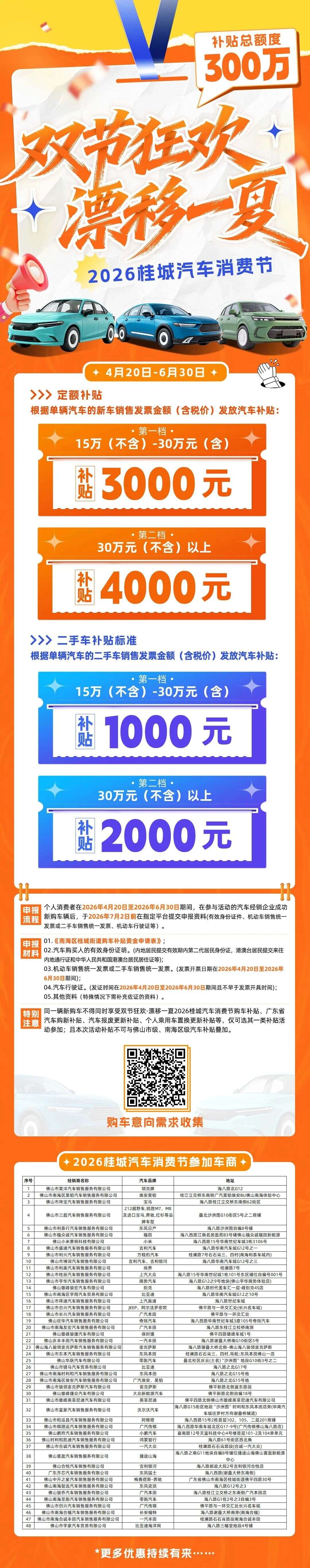 近日,禅城区南庄镇和南海区桂城街道分别推出总额300万元的购车补贴活动。其中,南庄镇活动时间为5月1日至4日,个人消费者(营运车辆及企业除外)在该镇汽车经销企业购买新车并完成注册登记,最高可补4000元,按发票金额分档执行;桂城街道活动时间为即日起至6月30日,个人消费者在参与活动的桂城街道汽车经销企业购买乘用车新车或二手车并完成注册登记,可按补贴标准申领对应补贴。
