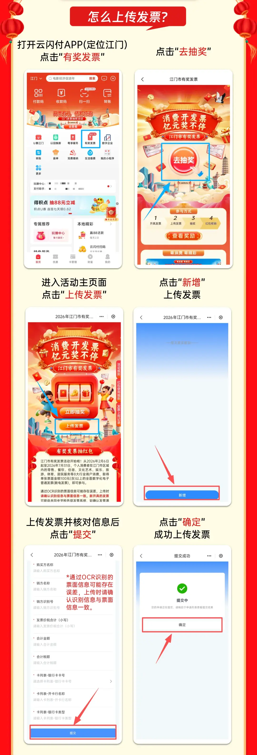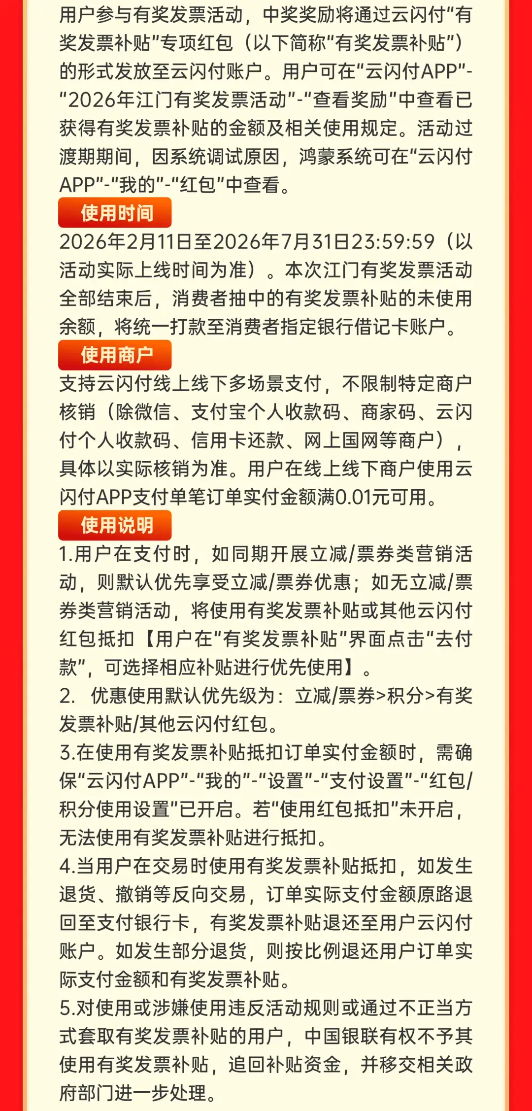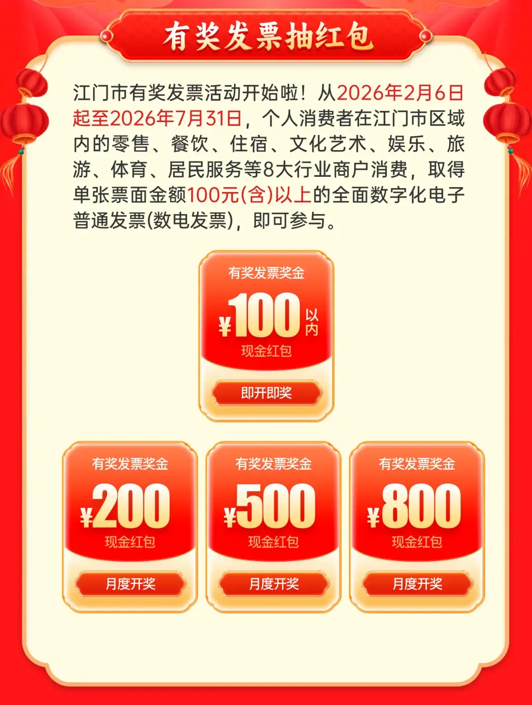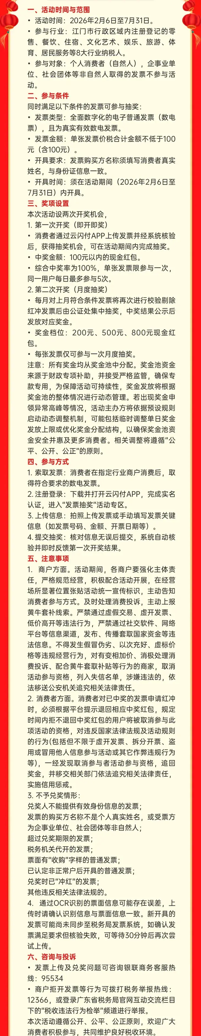 从5月1至7日,在江门市内注册登记的零售、餐饮、住宿、文化艺术、娱乐、旅游、体育、居民服务业八大行业消费满100元,主动索取发票,即可通过云闪付或京东平台,上传发票参与活动,100%中奖,一起瓜分300万元“即开即奖”红包,让每一位在江门消费的市民游客都能收获额外惊喜!